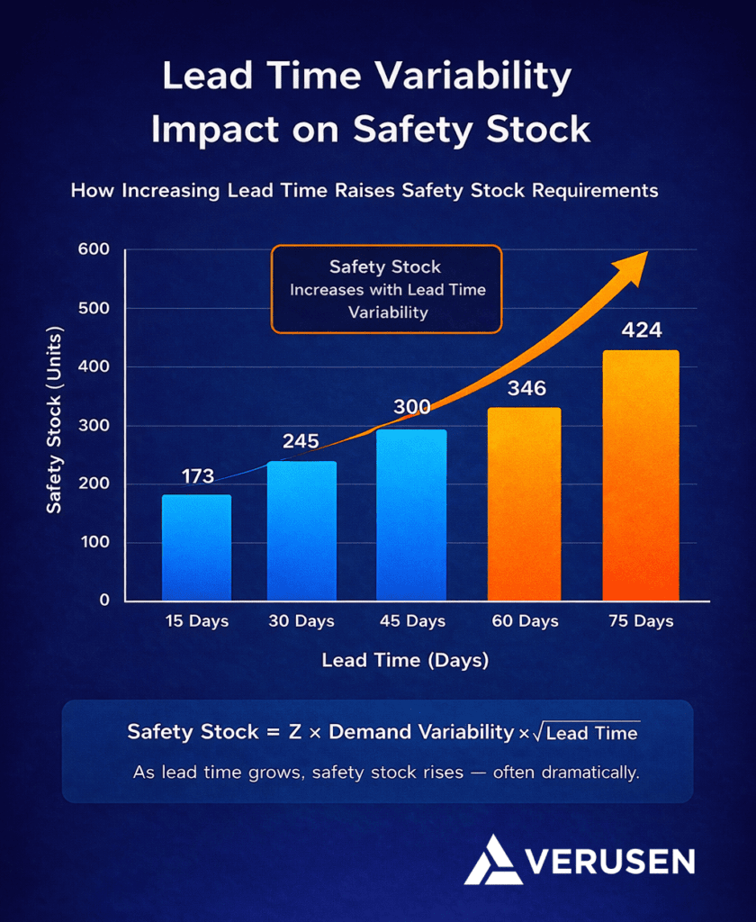 If lead time increases from 30 days to 75 days and the system does not update, safety stock becomes insufficient.